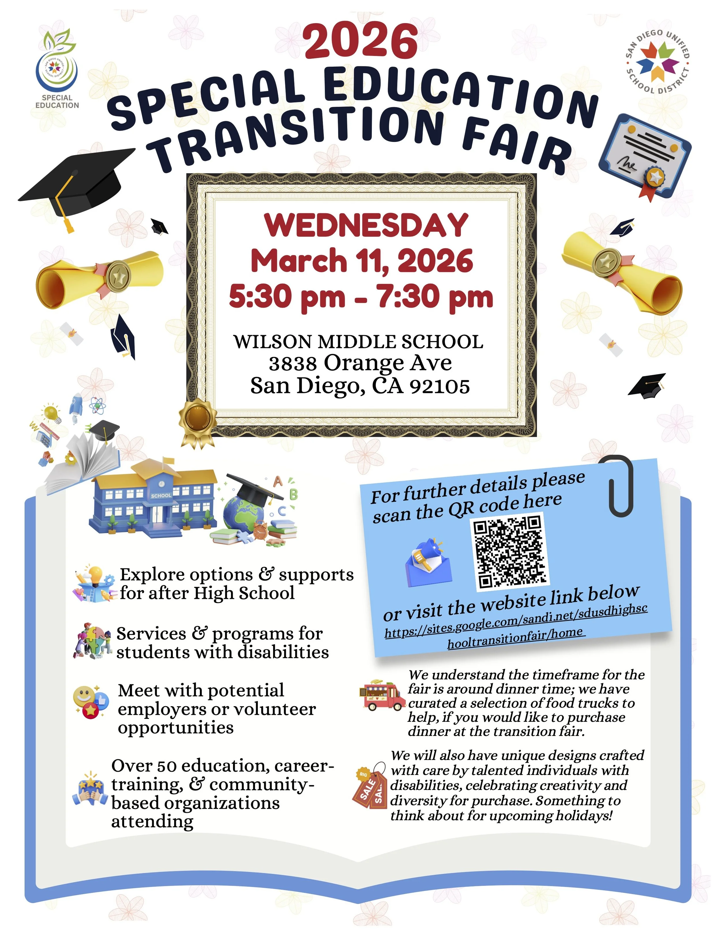 Description: The SDUSD Spring Transition Fair is designed to help students with disabilities and their families explore the next steps after high school. The event brings together community organizations, support programs, and service providers offering resources related to transition planning, independent living, employment support, education pathways, and community engagement opportunities. Families will have the chance to speak directly with representatives from local programs and learn about services available to support young adults with disabilities as they move toward greater independence.